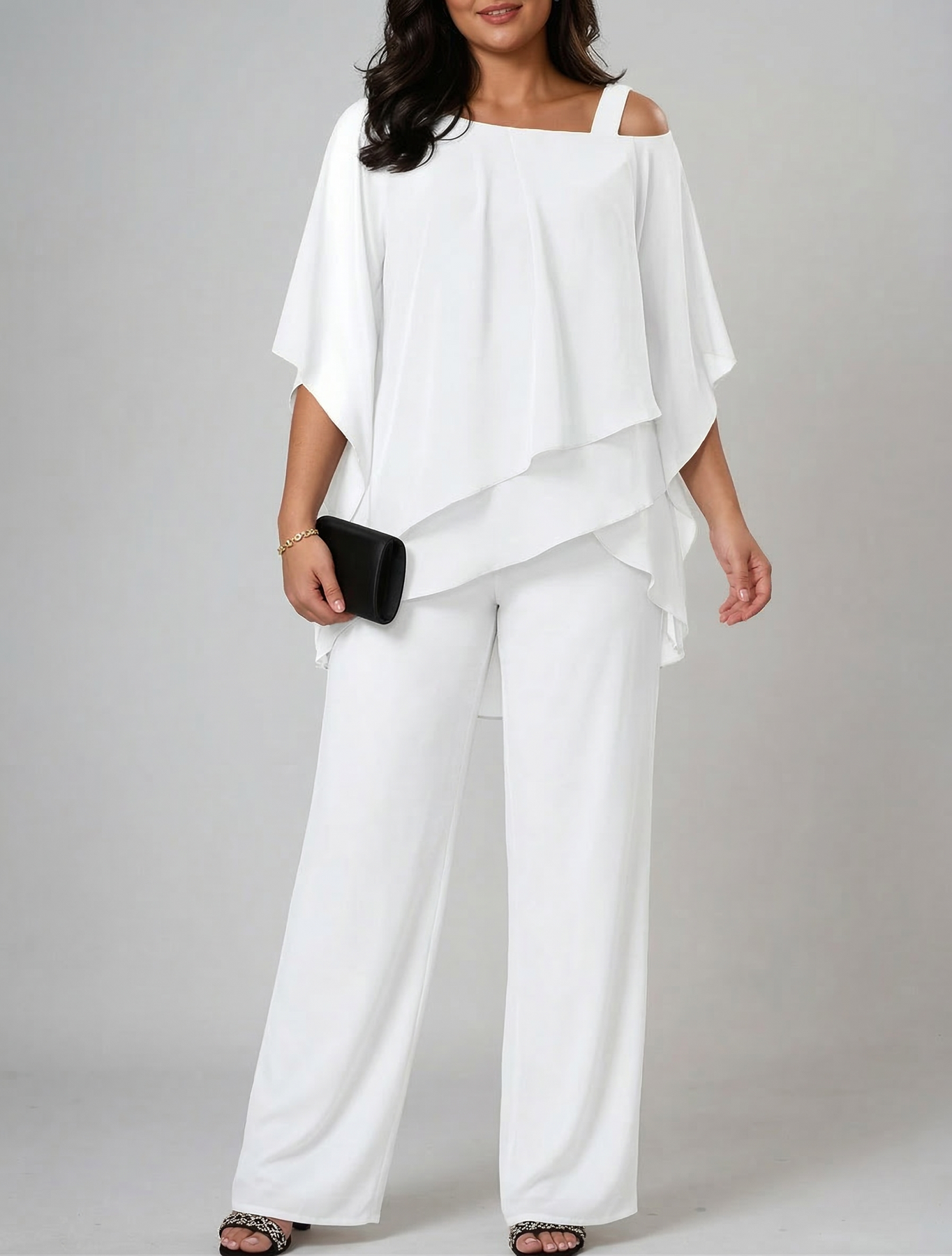 - Top: Asymmetrical flat design with open shoulder detail